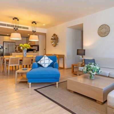 The residence is comprised of 5 bedrooms, 2 master bathrooms, 4 on-suite guest bathrooms, 2 powder rooms, 2 offices, 2 dressing rooms, a media room, an oversized eat-in gourmet chef’s kitchen, and a sprawling 1,100 square-foot Great Room perfectly situated in the prime southwest corner of the floor.